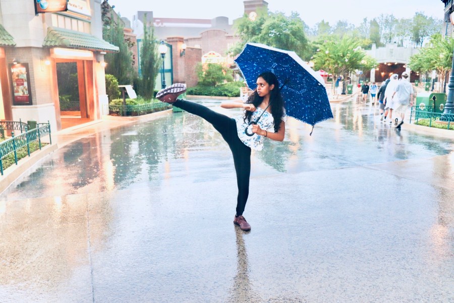 Even though Liza, one of our Grace Martial Arts students, is carrying an umbrella she can still deal with an attacker by keeping her free arm up and pointing toward her opponent. Her side kick follows her eyes to her target. Liza could also use her umbrella as a defensive weapon. We’ll look at how to do that in a future article.
